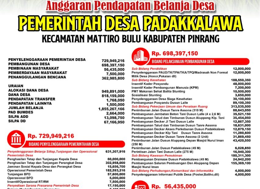 padakkalawa.desa.id, Lalle. Pemerintah Desa Padakkalawa Kecamatan Mattiro Bulu Kabupaten Pinrang membuka informasi khususnya kepada masyarakat Desa Padakkalawa itu sendiri melalui website desa tentang Anggaran Pendapatan… Selengkapnya »Berikut Link Info Transparansi APBDes 2022 Padakkalawa